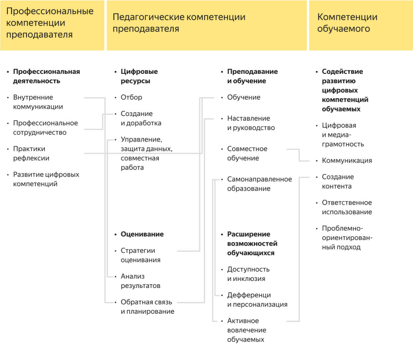 Для оценки навыков учителей может использоваться Европейская модель цифровых компетенций педагога (DigCompEdu). Она выделяет 22 элементарные цифровые компетенции в шести группах: